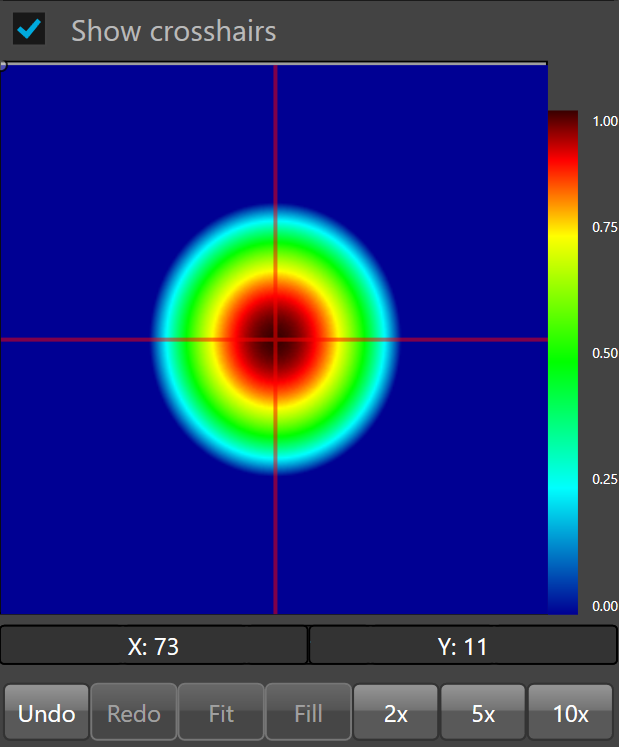 When there is no tracking error the correlation peak is perfectly centered at the middle of the view port and with the red cross hairs when enabled.